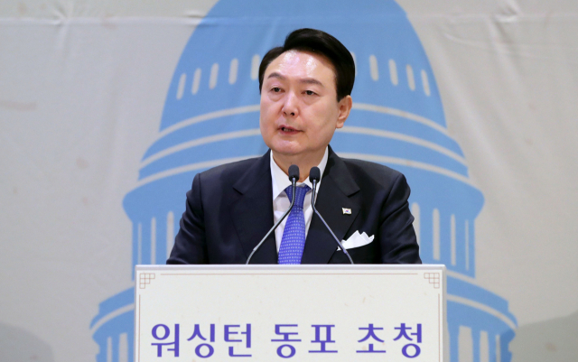 미국을 국빈 방문한 윤석열 대통령이 24일(현지시간) 워싱턴DC 한 호텔에서 열린 워싱턴 동포 초청 만찬 간담회에서 격려사를 하고 있다. 연합뉴스