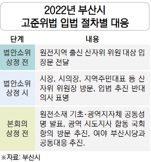 국회 산업통상자원중소벤처기업위원회는 2월과 3월 두 차례 고준위법을 안건으로 상정했지만 박형준 부산시장과 안성민 부산시의회 의장은 국회를 항의 방문하지 않았다. 시의회는 핵폐기장화 우려에도 정부 눈치만 본다는 지적(부산일보 3월 8일 자 4면 보도)이 나온 이후에야 ‘원전 내 건식저장시설 영구화 반대 결의안’을 채택해 국회에 전달했다.
