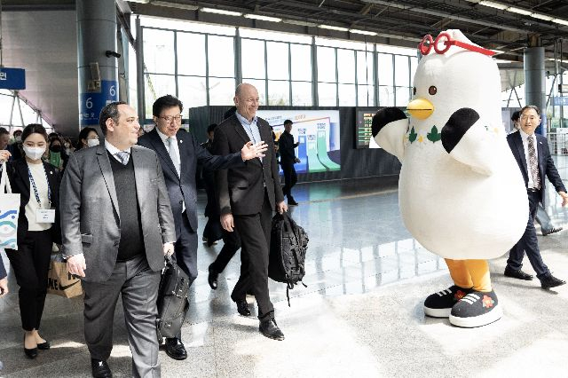 지난 4일 오전 부산역에 도착한 국제박람회기구 실사단을 환영하고 있는 2030부산엑스포 마스코트 '부기'. 부산시 제공