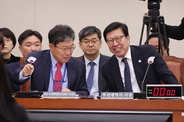 박형준(오른쪽) 부산시장과 윤상직 2030부산세계박람회(월드엑스포) 유치위원회 사무총장이 26일 오전 국회에서 열린 ‘2030부산세계박람회 유치지원 특별위원회’에서 대화하고 있다. 연합뉴스