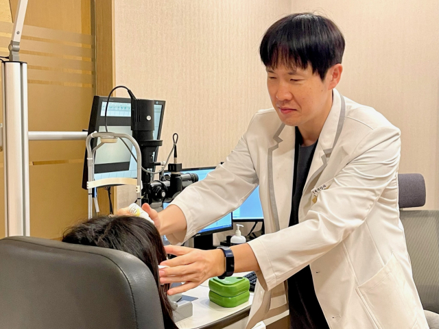 신세계안과 박재홍 원장이 환자에게 안약 점안하는 방법을 설명하고 있다. 신세계안과 제공