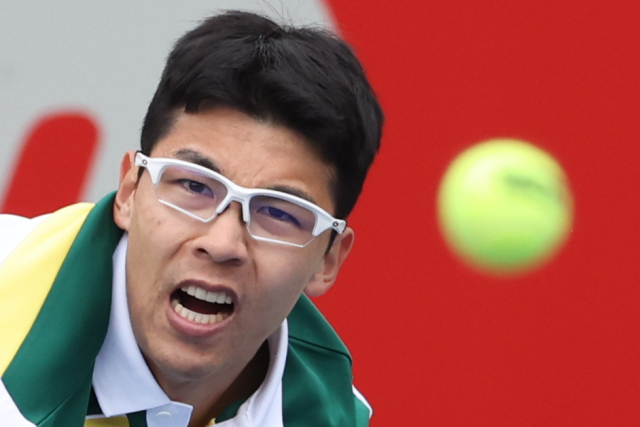 정현이 26일 서울 송파구 올림픽테니스경기장에서 열린 남자프로테니스(ATP) 투어 서울오픈 챌린저 대회에서 호주의 조던 톰프슨과 단식 32강 경기를 펼치고 있다. 이날 정현이 치른 단식 경기는 2020년 9월 프랑스오픈 이후 2년 7개월 만이다. 연합뉴스