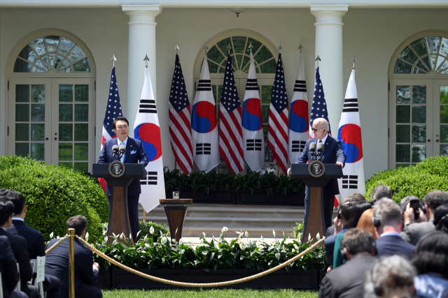 미국을 국빈 방문한 윤석열 대통령과 조 바이든 미국 대통령이 26일(현지시간) 워싱턴DC 백악관 로즈가든에서 공동기자회견을 하고 있다. 연합뉴스