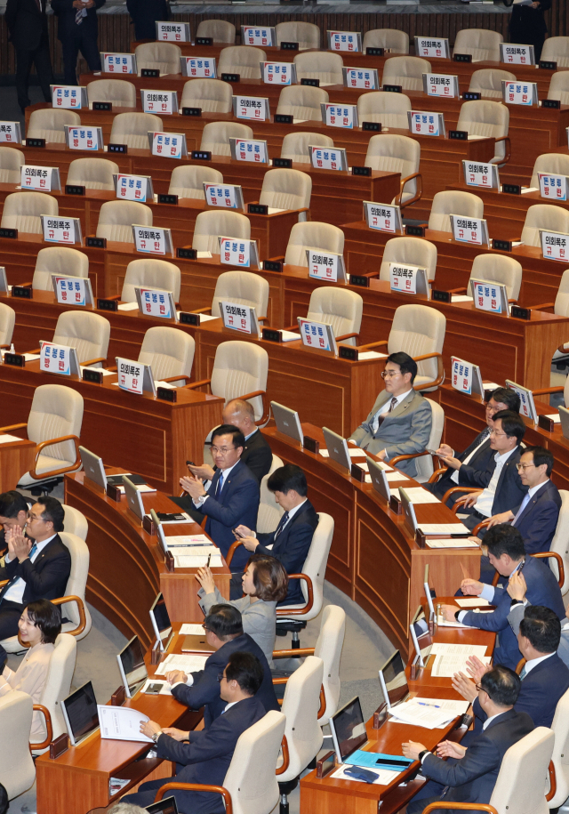 27일 국회 본회의에서 ‘쌍특검’ 법안 패스트트랙 지정 후 민주당 의원들이 박수치고 있다. 국민의힘 의원들은 투표 전 퇴장했다. 연합뉴스
