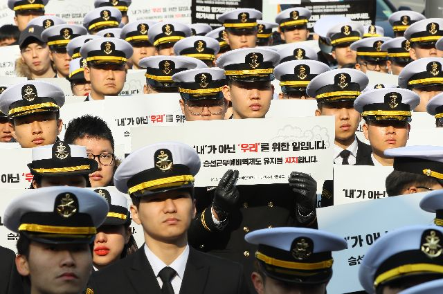 2019년 2월 세종시 정부세종청사 해양수산부 앞에서 한국해양대, 목포해양대, 부산해사고, 인천해사고 등 4개 해양계 학생들이 '승선근무 예비역제도 유지'를 촉구하고 있다. 연합뉴스