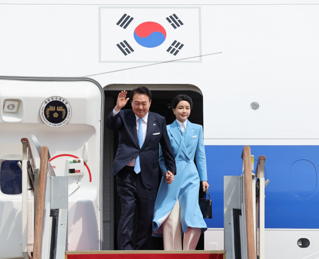 미국 국빈 방문 일정을 마친 윤석열 대통령과 김건희 여사가 지난 30일 성남 서울공항에 도착한 후 공군 1호기에서 내리며 환영객들에게 손을 들어 인사하고 있다. 연합뉴스