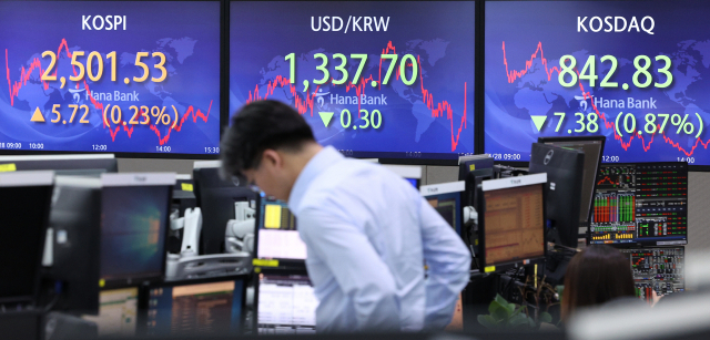 외국계 증권사 소시에테제네랄(SG)증권발 급락 사태가 코스피 시장에서 ‘4거래일 연속 하한가’라는 초유의 기록을 만들어 냈다. 지난달 28일 서울 중구 하나은행 딜링룸 스크린에 지수가 띄워져 있다. 연합뉴스
