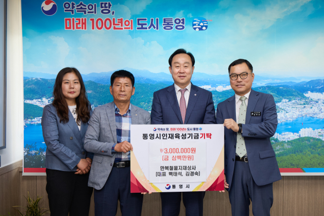 경남 통영시 만복철물자재상사(대표 백태석)는 지난 1일 통영시청에서 천영기 시장에게 지역 인재 육성을 위한 기금 300만 원을 전달했다.