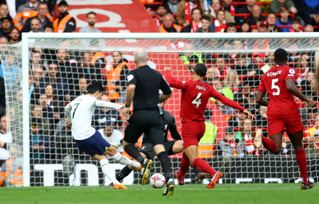 토트넘의 손흥민(왼쪽)이 1일 영국 리버풀의 안필드에 열린 2022-2023 잉글랜드 프로축구 프리미어리그(EPL) 리버풀과의 원정 경기에서 리그 10호 골을 터트리고 있다. 로이터연합뉴스