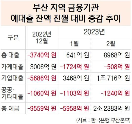 한국은행 부산본부가 발간한 ‘2월 부산지역 금융기관 여·수신 동향 자료’에 따르면 지난 2월 부산 금융기관 여신(대출)은 194조 1000억 원으로 전국 3049조 3000억 원의 6.4%를 기록했다. 부산의 전월 대비 대출 증가 폭은 1월 641억 원에서 2월 8968억 원으로 크게 늘었다.