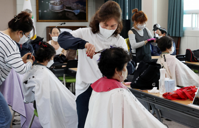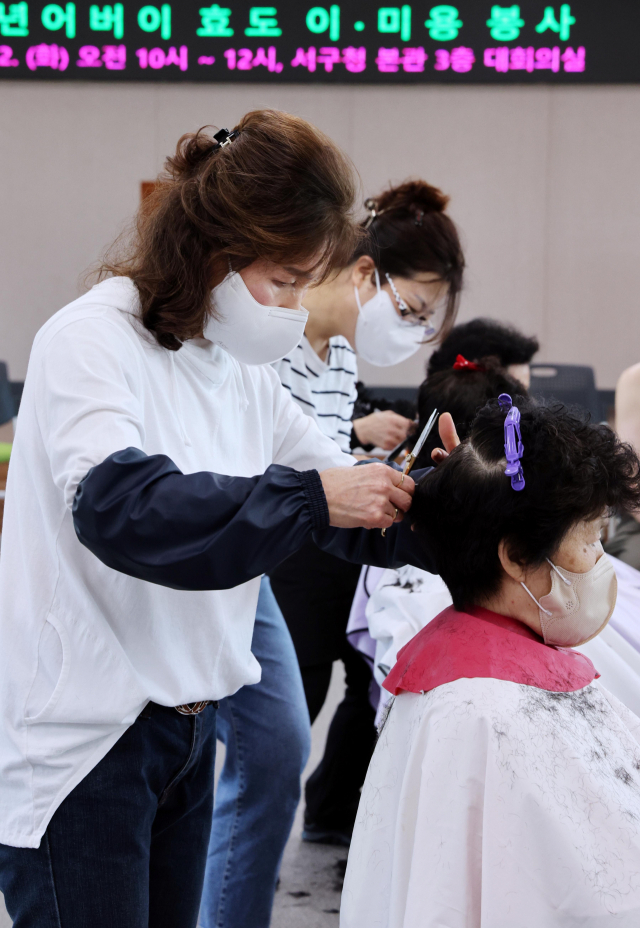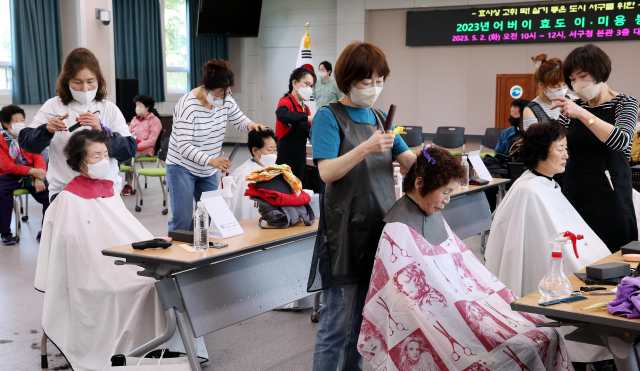 어버이날을 앞두고 2일 오전 부산 서구청 대회의실에서 열린 ‘어버이 효도 이·미용 봉사’ 행사에서 미용사들이 어르신들의 머리를 다듬어주고 있다. 이날 봉사활동에는 이·미용사회 서구지회 회원 16명이 참가해 어르신 100여 명에게 서비스를 제공했다.