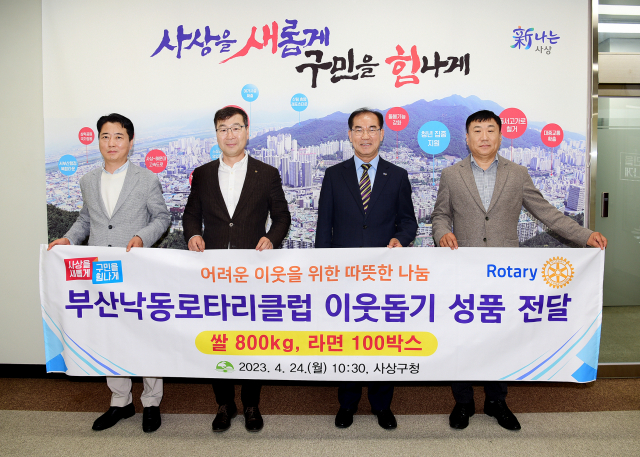 부산 사상구(구청장 조병길)는 지난달 24일, 국제로타리3661지구 부산낙동로타리클럽(회장 손상호)으로부터 취약계층을 위한 성품(쌀 40포, 라면 100박스)을 기탁 받았다.