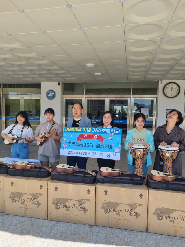 김 회장은 이날 가조초등학교에 우쿨렐레 35대, 젬베 2대를, 가조중학교에는 체육복 상하의 세트를 각각 기탁했다.