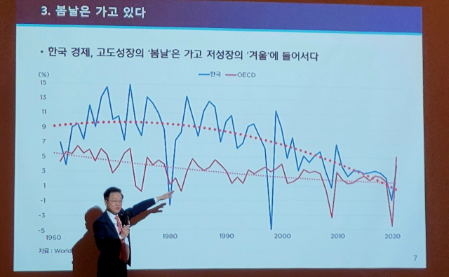 강석훈 산업은행 회장이 지난달 12일 롯데호텔 부산에서 열린 부산상공회의소 주최 부산경제포럼에서 강연하고 있다. 연합뉴스