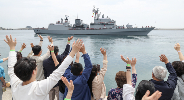 3일 해군작전사령부 부산기지에서 청해부대 40진 광개토대왕함 승조원들이 가족, 친지들의 환송을 받으며 출항하고 있다. 40진은 39진 충무공이순신함과 아덴만 해역에서 임무 교대 후 선박호송 작전, 안전 항해 지원 임무를 수행한다. 김종진 기자 kjj1761@