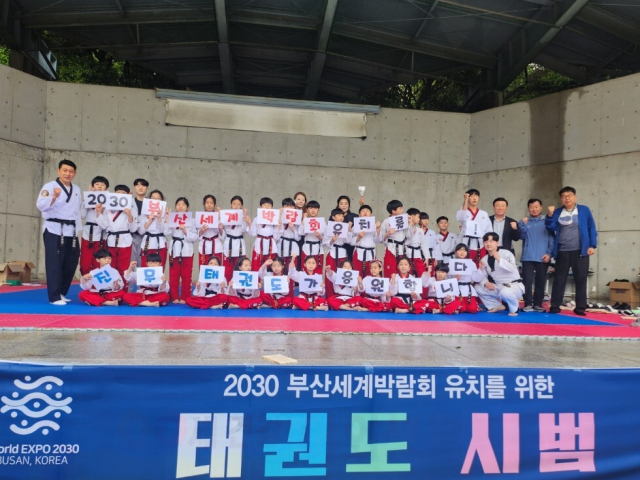 부산 해운대구 좌동 진무태권도 도장(관장 하진호)은 6일 해운대구 대천공원에서 원생 50여 명이 참가한 가운데 2030 부산세계엑스포 유치 기원 태권도 시범을 보였다.