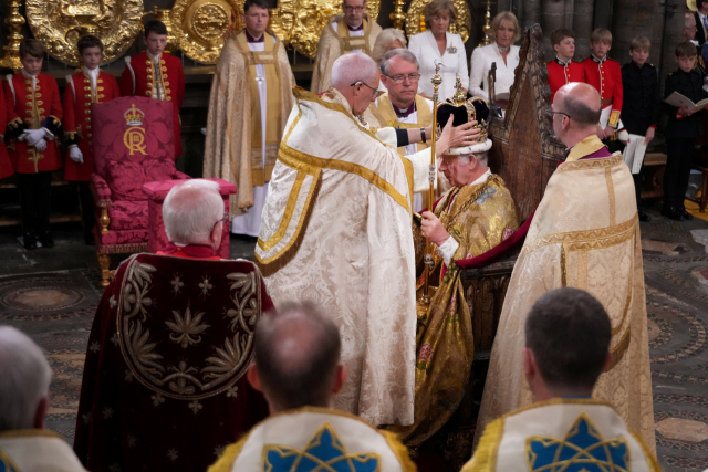 찰스 3세는 서약식에서 “하느님의 이름으로, 그의 본보기로서 나는 섬김받지 않고 섬기겠다”고 선언했다. 웰비 대주교는 성유 의식 이후 ‘성 에드워드 왕관’을 찰스 3세의 머리 위에 얹었다. 성 에드워드의 왕관은 보석 444개가 박힌 무게 2.23kg의 영국 대관식 왕관이다.