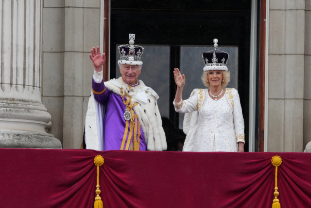 버킹엄 궁전 발코니에서 기념 촬영을 하는 찰스 3세와 커밀라 왕비. UPI연합뉴스