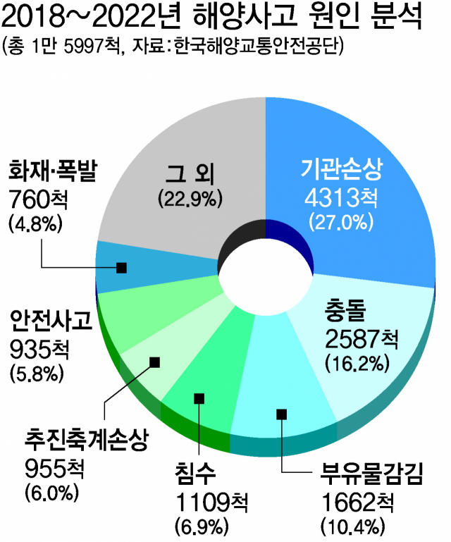 7일 한국해양교통안전공단(KOMSA)이 해양교통안전정보시스템(MTIS)을 활용해 2018~2022년 5년간 해양 사고를 분석한 결과, 전체 사고 선박 수 총 1만 5997척 가운데 기관손상 사고 발생 선박 수는 4313척으로, 27%를 차지했다.