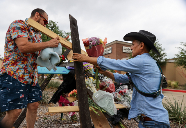 지난 6일 미국 텍사스주 댈러스 앨런의 프리미엄 아울렛 매장 입구에서 발생한 총기 난사 사건 희생자 중 한인 일가족 3명도 포함돼 있는 것으로 밝혀졌다. 7일(현지 시간) 사건 현장인 아울렛 매장 입구에서 주민들이 총기 난사 사건 희생자들을 위해 십자가를 세우고 있다. EPA연합뉴스