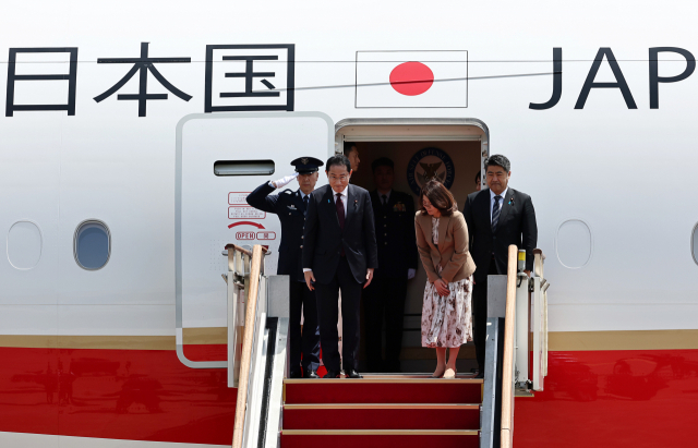 방한 일정을 마친 기시다 후미오 일본 총리가 8일 경기도 성남시 서울공항에서 일본행 전용기에 올라 인사하고 있다. 연합뉴스