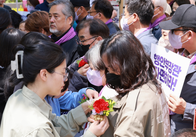 어버이날인 8일 서울 서울광장 이태원 참사 희생자 합동분향소 앞에서 열린 ‘10·29 이태원 참사 200일, 200시간 집중추모행동 주간’ 선포 기자회견에서 참석자들이 유가족에게 카네이션을 달아 주고 있다. 연합뉴스