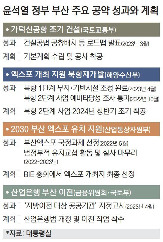 윤석열 대통령 취임 이후 1년 동안 부산의 현안들은 과거 어느 정부 때보다 빠른 속도로 진행되고 있다는 평가다. 윤 대통령이 대선 후보 시절 공약으로 내세웠던 ‘2030 부산세계박람회 유치 추진’은 현 정부 국정과제로 선정되면서 범국가적 역량이 결집되고 있다.