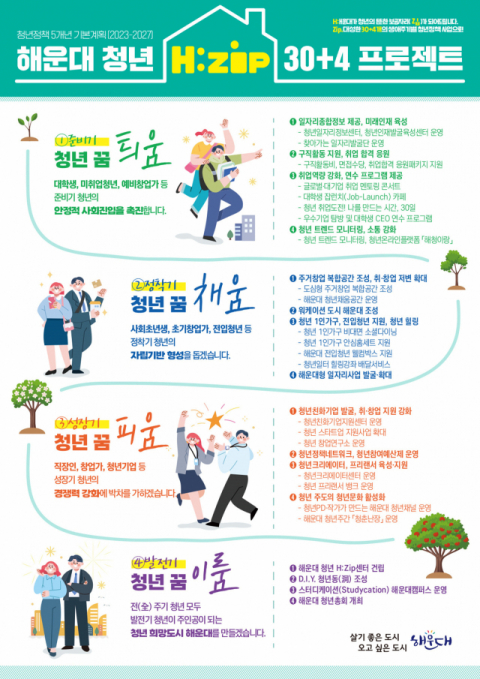 해운대구(구청장 김성수)는 청년이 살기 좋고, 오고 싶은 도시 해운대를 만들기 위해 청년정책 5개년 기본계획인 ‘해운대 청년 H:Zip.30+4 프로젝트’를 추진한다.