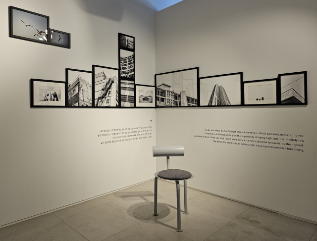 전시장에 ‘허망’과 ‘땀동네’ 두 장의 사진이 비스듬한 위치에 마주 걸려 있다. 여기에는 높은 건물과 옹기종기 모인 낮은 건물을 대비해서 보여주려는 의도가 담겼다. “높은 건물도 하늘과 함께 보면 한없이 낮고 작은 건물에 불과해요. 가장 높게 올라가려 했기에 주위에 같은 높이의 건물도 없어요. 그런 모습이 오히려 외롭고 허망하게 보였어요.” 작가는 그런 건물의 모습을 통해 자기 속에 있을지 모를 욕심을 경계했다. “반면에 옹기종기 작은 집들이 서로 비슷한 위치에서 높고 낮음을 경쟁하면서 같이 있는 모습이 더 따뜻하게 느껴졌어요.”