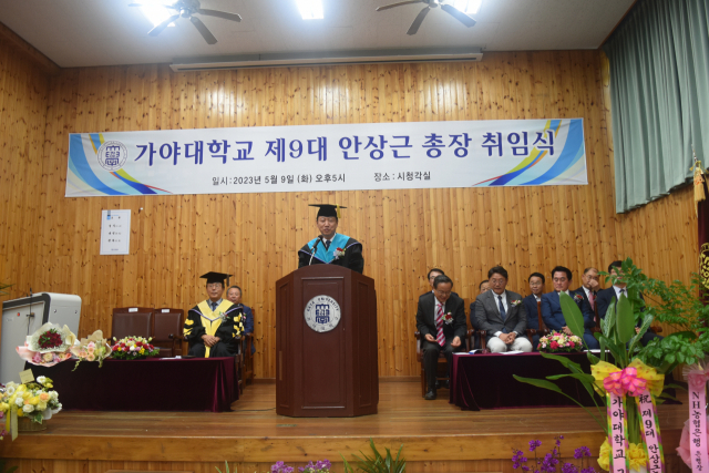 가야대학교는 9일 대학 시청각실에서 ‘제9대 안상근 총장 취임식’을 진행했다. 가야대 제공