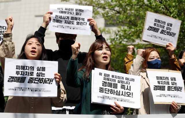 전세사기피해자전국대책위원회 회원들이 지난달 21일 오전 인천지방법원 앞에서 열린 전세사기 피해 주택 경매 매각기일 직권 변경 요청 기자회견에서 구호를 외치고 있다. 2023.4.21 tomatoyoon@yna.co.kr (끝)