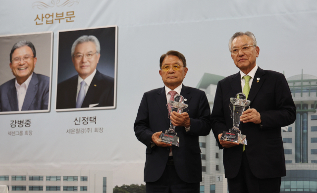 강병중 넥센그룹 회장과 신정택 세운철강 회장이 10일 부산상공회의소에서 열린 ‘제14회 동명대상 시상식’(산업 분야)에서 수상의 영예를 안았다. 시상금은 각 1000만 원이다.