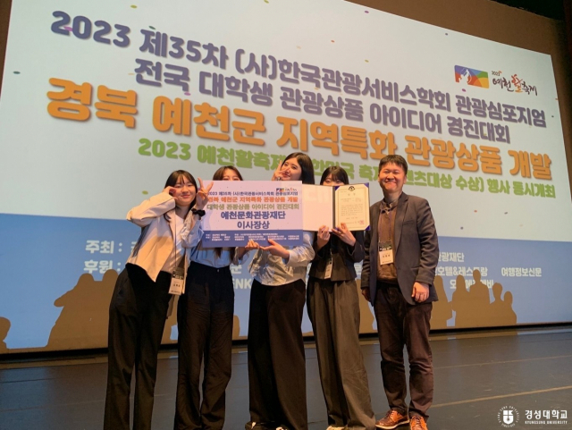 경성대학교(총장 이종근) 글로컬문화학부(학부장 김재기) 학생들이 지난 6일부터 7일까지 양일간 경상북도 예천군 문화회관에서 개최된 ‘2023년 제35차 경북 예천군 지역특화 관광상품 개발 관광 심포지엄 및 전국 대학생 관광아이디어 경진대회’에서 예천문화관광광재단 이사장장을 수상했다.