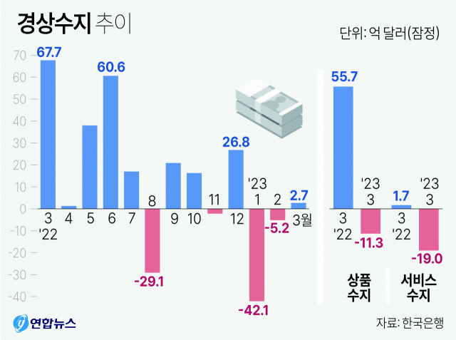항목별 수지를 보면, 상품수지가 11억 3000만 달러 적자였다. 6개월 연속 적자일 뿐 아니라 1년 전(55억 7000만 달러)보다 수지가 66억 9000만 달러나 급감했다. 우선 수출(564억 달러)이 작년 3월보다 12.6% 줄었다. 앞서 지난해 9월 수출이 23개월 만에 처음 전년 같은 달보다 감소한 뒤 7개월 연속 뒷걸음이다.