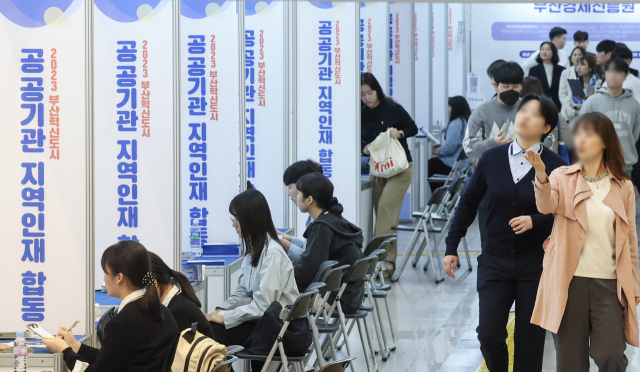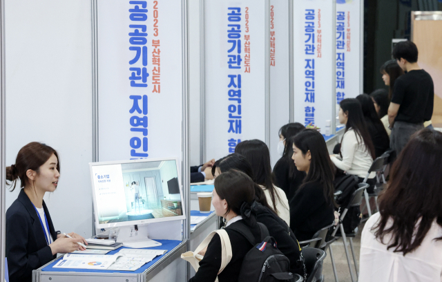 10일 부산시청 1층 로비에서 열린 2023 부산혁신도시 공공기관 지역인재 합동 채용설명회가 열려 취업준비생들이 채용상담과 채용특강을 받고 있다. 이번 행사는 국토교통부와 국가균형발전위원회가 주최하고 부산시가 주관하는 코로나19 이후 4년만에 부산지역 공공기관 취업 정보를 제공하는 대규모 채용설명회로 부산혁신도시로 이전한 공공기관, 시 산하 공공기관, 금융기관 등 총 22개 기관이 참가했다.
