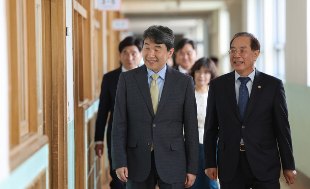 이주호 부총리 겸 교육부 장관이 하윤수 부산시교육감 등과 함께 스승의날을 앞두고 11일 오후 부산 북구 덕천중학교에서 일일교사 체험을 하기 위해 교실로 이동하고 있다.
