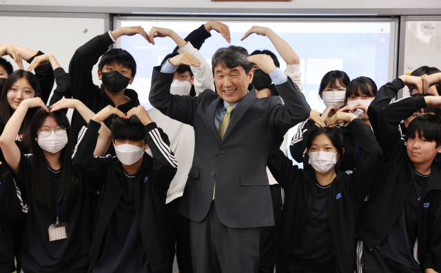 이주호 부총리 겸 교육부 장관이 스승의 날을 앞두고 11일 오후 부산 북구 덕천중학교에서 1일 교사 체험을 한 뒤 학생들과 기념사진을 촬영하고 있다.