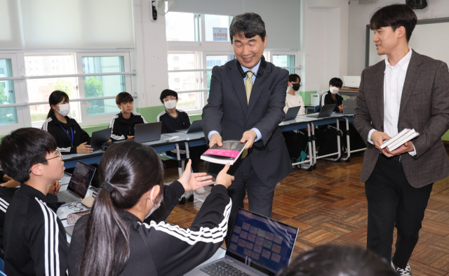 이주호 부총리 겸 교육부 장관이 11일 오후 부산 북구 덕천중학교에서 학생들에게 책을 선물하고 있다.