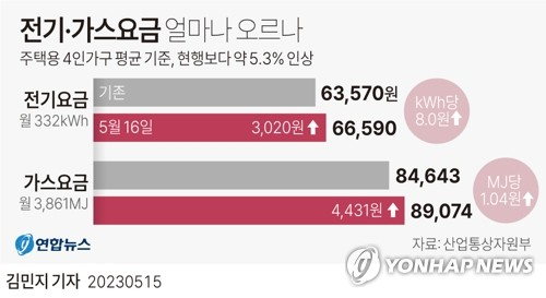 이날 정부가 전기요금을 kWh당 8원 인상하면서 16일부터 적용되는 2분기 전기요금은 기존 kWh당 146.6원에서 154.6원으로 인상됐다. 이는 부가세와 기반기금 등을 제외한 것이다. 가스요금의 인상률은 주택용의 경우 기존 MJ당 현행 19.6910원에서 20.7354원으로 5.3%(1.0444원) 인상됐다.