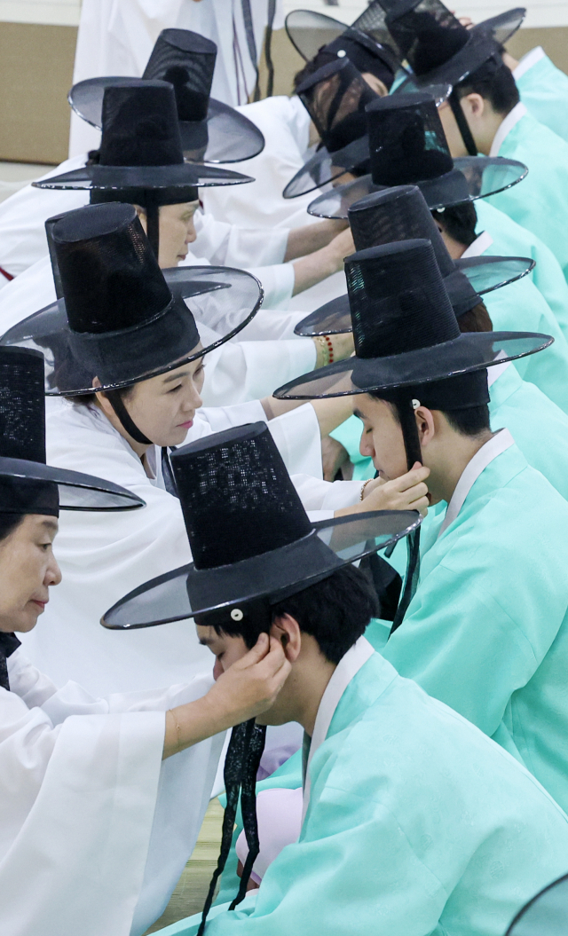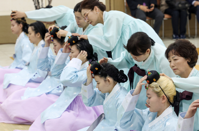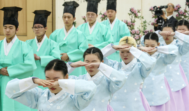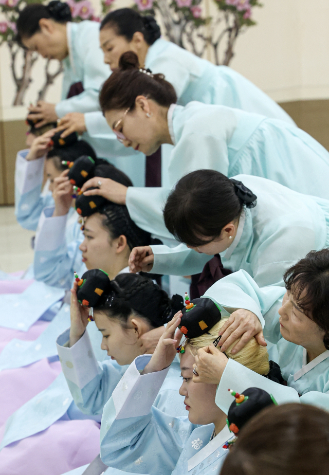 성년의날을 맞아 15일 부산 사상구 여성문화회관에서 전통 성년례 재현행사가 열렸다. 이날 행사는 큰손님과 성년자 간 인사를 나누는 상견례, 성년자에게 세 가지 축사를 하는 삼가례, 갓을 씌우고 비녀를 꽂는 의식인 관례와 계례, 성년자에게 성년선언문을 전달하는 성년선서와 선언, 성년에게 교훈을 전달하는 수훈례 순으로 진행됐다.