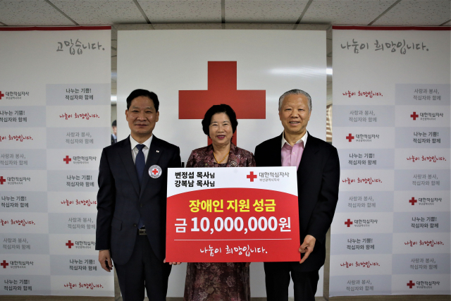 변정섭(오른쪽) 목사(부산복지중앙교회 당회장 목사)와 강복남(가운데) 목사 부부가 부산지역 장애인의 복지 향상을 위해 1000만 원을 기부했다고 대한적십자사 부산시지사(회장 서정의)가 16일 밝혔다.