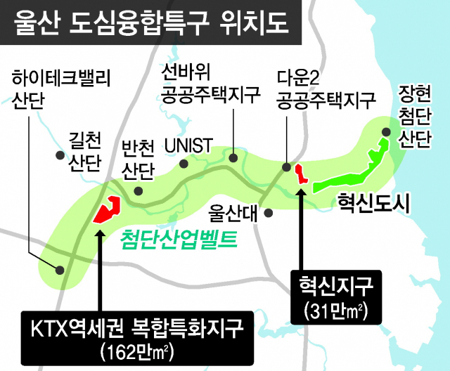 사업 대상지는 울산 KTX역세권 162만㎡와 중구 테크노파크 일원 혁신지구 31만㎡ 등 총 193만㎡로 5개 지방 도심융합특구 중 가장 범위가 넓다.