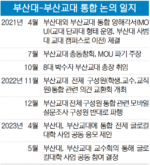 부산대와 부산교대의 통합 논의는 2021년 당시 부산교대 오세복 총장과 부산대 차정인 총장이 ‘통합 양해각서’를 맺으며 시작됐다. 하지만 두 대학은 당시 구성원 의견수렴 없이 총장 합의로 통합에 시동을 거는 바람에 부산교대 구성원 내부의 반발에 부딪혔다. 부산교대의 교수진, 직원, 학생 모두 사실상 통합에 반대해 통합 논의는 교착 상태에 빠졌다. 지난해 9월 취임한 부산교대 박수자 총장이 지난해 11월 투표 등의 방식으로 부산교대 구성원 의견 수렴을 추진했으나 학생 반발로 무산됐고, 이후 통합은 사실상 무산되는 수순에 들어갔다.