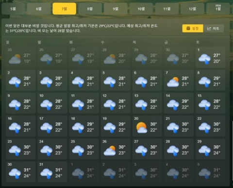 마이크로소프트사가 인공지능(AI)을 이용한 수치모델로 예보했다는 우리나라 올해 7월의 일기예보 스크린 샷. 사흘간을 빼고 모두 비가 내리는 것으로 예보돼 있다.