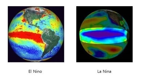 엘니뇨와 라니냐의 지구 해수면 온도 분포. 왼쪽 엘니뇨 때는 동태평양 페루 앞바다에서부터 수온이 올라 붉은색으로 변했고 오른쪽 라니냐에서는 동태평양 수온이 내려가 푸른색으로 표시돼 있다.
