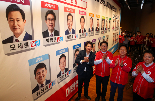 내년 총선이 가까워질수록 부산 국민의힘 의원들이 윤석열 대통령 띄우기에 나서고 있다. 지난해 6·1 지방선거 당시 국회 도서관에 마련된 국민의힘 개표상황실에서 당 지도부 인사들이 박수를 치고 있다. 부산일보DB