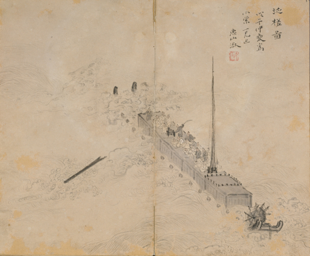 1856년 역관 김계운의 문위행 귀환을 그린 ‘범사도(泛槎圖)’. 풍랑을 만나 일본인이 칼을 뽑아 돛대를 자르는 절박한 장면이 생생히 묘사돼 있다. 부산박물관 제공