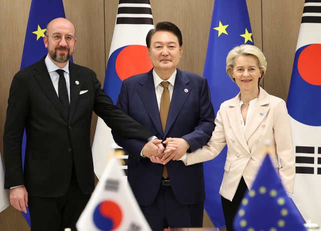 윤 대통령은 이날 서울 용산 대통령실에서 우르줄라 폰데어라이엔 EU 집행위원장, 샤를 미셸 EU 정상회의(이사회) 상임의장과 정상회담을 갖고 이 같은 내용의 공동성명을 발표했다.