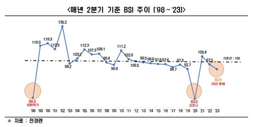 전경련이 매년 2분기 평균 BSI를 환산한 결과, 이 같은 수치는 외환위기가 발생한 1998년 2분기(64.3) 이후 코로나19 초기였던 2020년 2분기(63.3)에 이어 두 번째로 낮은 것이다.