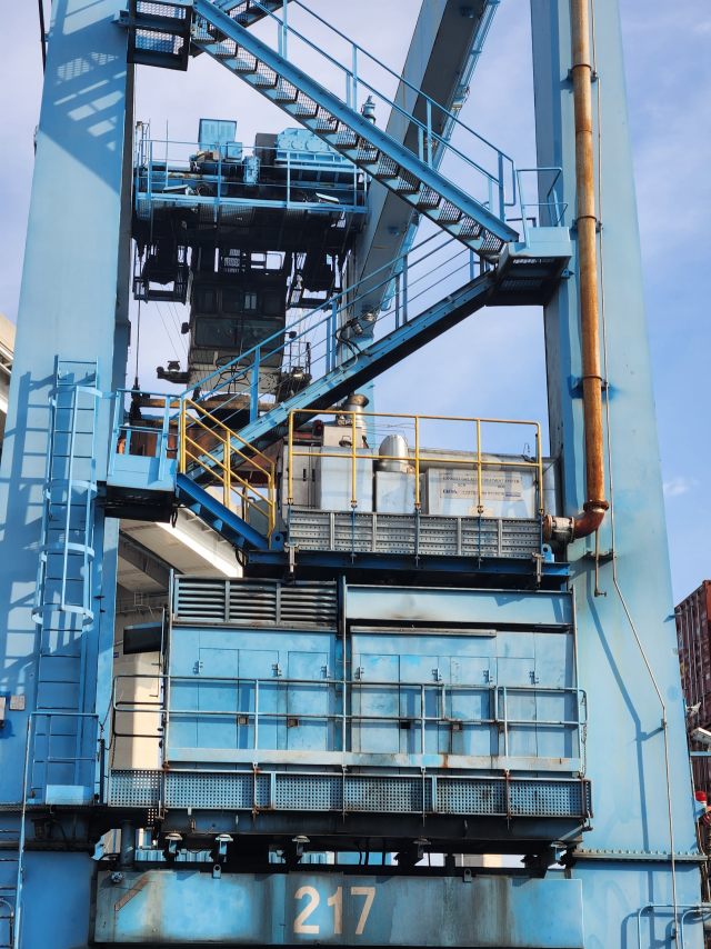 배출가스저감장치(DPF)를 설치한 트랜스퍼크레인(T/C). 부산항만공사 제공